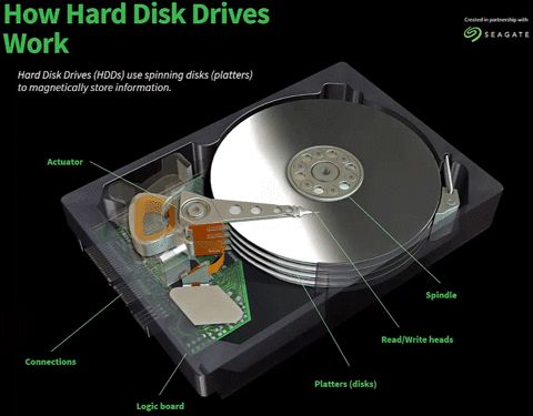 즉, 둘 다 뭔가를 기억(데이터를 저장)하는 장치인데 Memory는 전기의 속도로 읽고 쓰고, Disk는 자석과 빛을 이용해서 읽고 쓴다는 것이다. 빛이라고해서 Disk가 더 빠르게 느껴질 수도 있지만, 실제로 Disk가 데이터를 저장하는 원리를 보면 가운데 원반이 여러겹 쌓여있고 이 원반이 물리적으로 빙글빙글 돌고 있을 때 헤드가 자기를 이용해서 특정 위치에 데이터를 쓰고 읽는 방식이다(참고, 하드디스크의 동작원리).